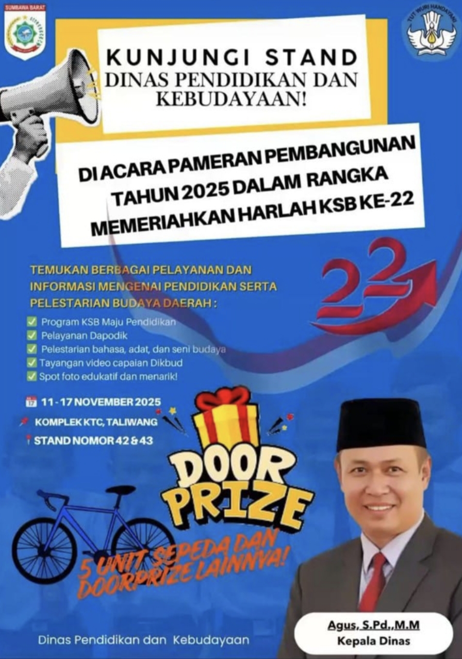Taliwang,harianntb.online,- Dinas Pendidikan dan Kebudayaan (Dikbud) Kabupaten Sumbawa Barat (KSB) berhasil menyabet Juara 1 Stand Pameran Pembangunan KSB 2025 yang diselenggarakan BRIDA KSB menjelang peringatan Hari Lahir Kabupaten Sumbawa Barat ke-22.