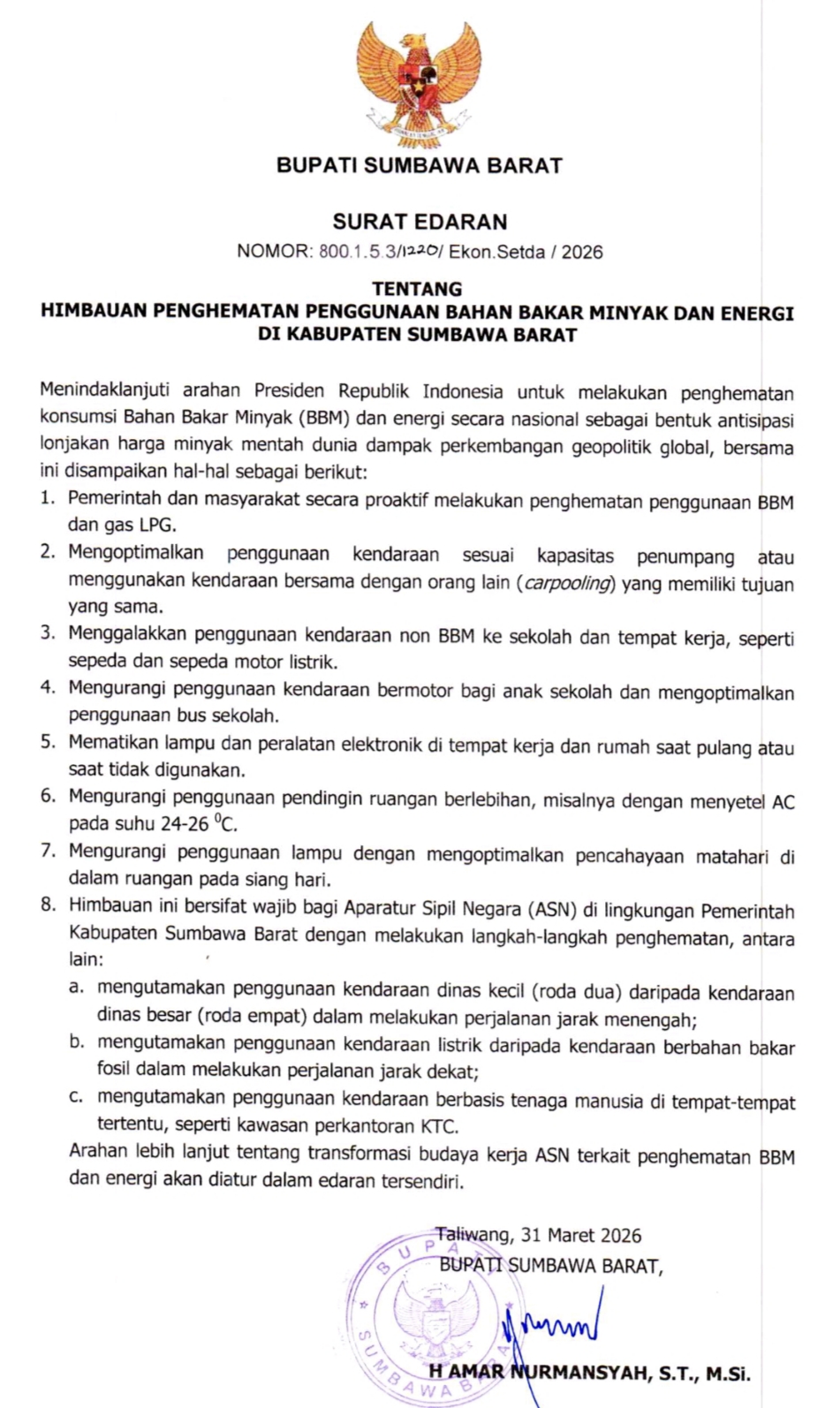 Bupati Sumbawa Barat, H. Amar Nurmansyah, secara resmi menerbitkan Surat Edaran Nomor 800.1.5.3/1220/Ekon.Setda/2026 yang menginstruksikan penghematan energi secara masif di seluruh penjuru daerah. Kebijakan strategis ini merupakan respons langsung terhadap arahan Presiden Republik Indonesia dalam mengantisipasi lonjakan harga minyak mentah dunia yang dipicu oleh eskalasi dinamika geopolitik global.